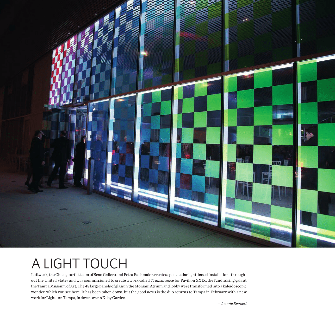 There is a story here, and it is one that Luftwerk wants you to experience not be told. If you could bottle the daytime Farnsworth, the magical feeling we all have as we walk around it, viewing from different angles, inside and out, and project it back on itself at night, without the “distraction” of the landscaping or the furniture – or the history – what would the house look like? How would it feel? The dots and squares and pixels are abstracted patterns of sunlight through the leaves of the overhanging trees and sunlight on water, referencing the nearby Fox River, the viscosity of glass, and the flow of time. What is Farnsworth now?